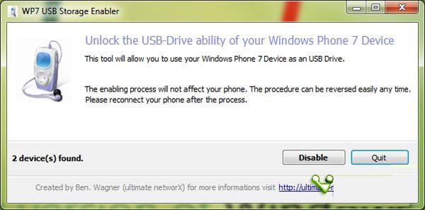 雖然微軟在WP7中不再提供把手機內存變成U盤這一功能,但來自xda開發者論壇的作者MarcHoover創建了一個可讓WP7手機支持USB Mass Storage功能的小應用,有興趣的朋友可以試一下。軟件安裝后需要Zune和.net 2.0都具備的前提下方可運行。