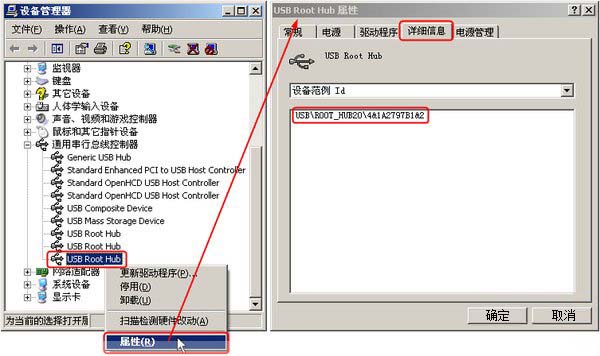注解:上面代碼就是先實現停用USB設備再啟用。后面那一長串東西需要你自己修改,方法是在“USB Root Hub”上右擊選擇“屬性”,再選擇“詳細信息”,用“設備范例ID”替換掉上面代碼中的即可。最后要注意的是,“@”和雙引號,這可是成敗的關鍵!