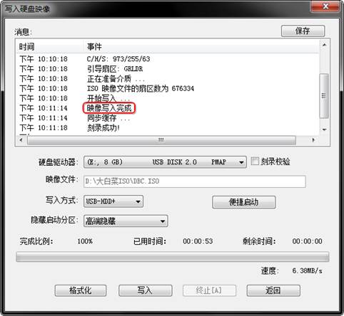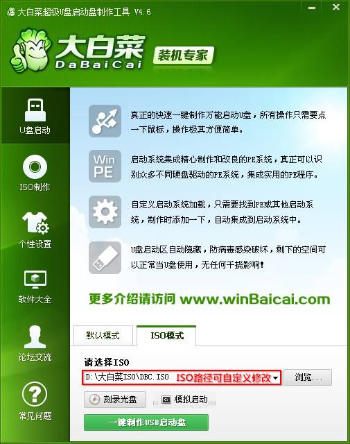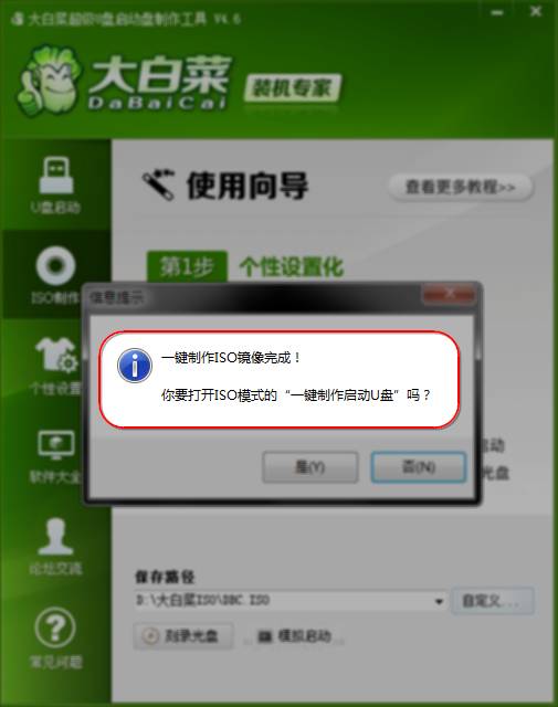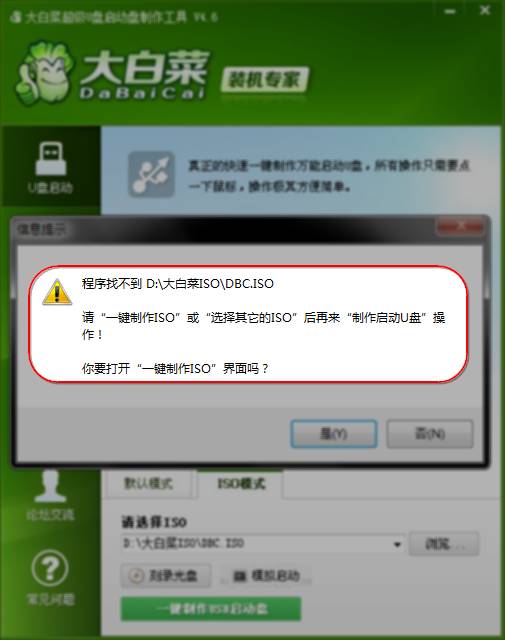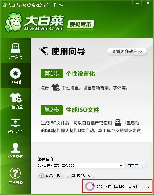 按鈕后程序會在“D:\大白菜ISO\”文件夾下創建DBC.ISO鏡像。