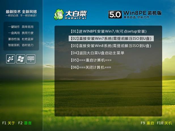 4、用U盤啟動電腦,選擇菜單12,然后選擇菜單2直接安裝Win7操作系統。