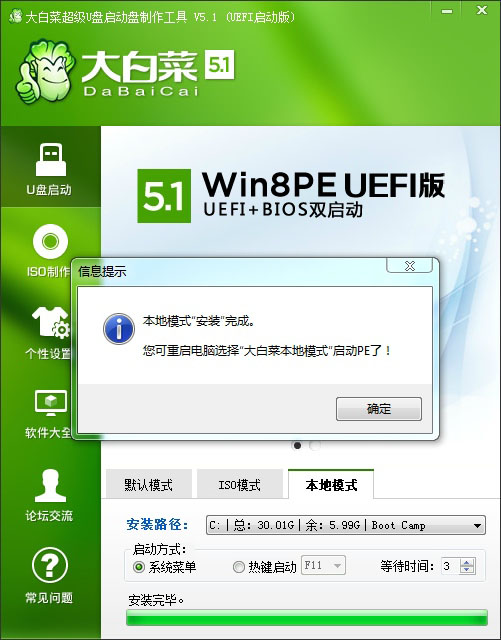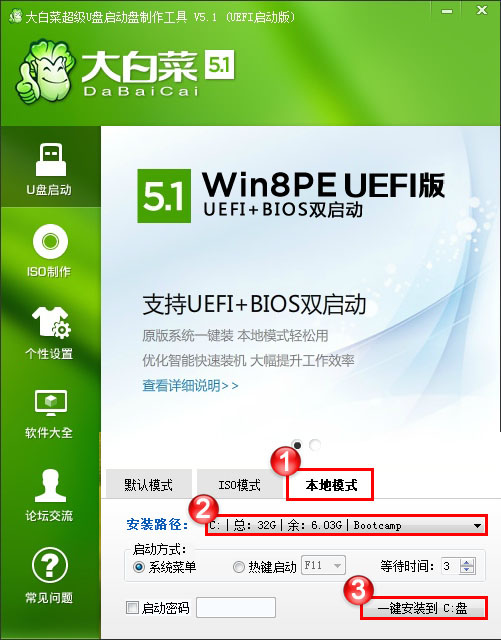 1、大白菜U盤啟動制作工具5.1以上版本的主程序都包含本地模式功能。切換到本地模式,選擇安裝路徑以及啟動方式。