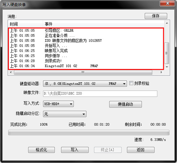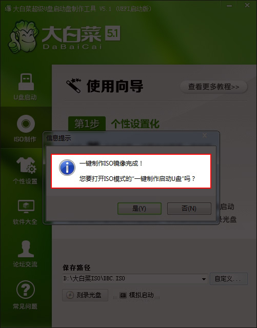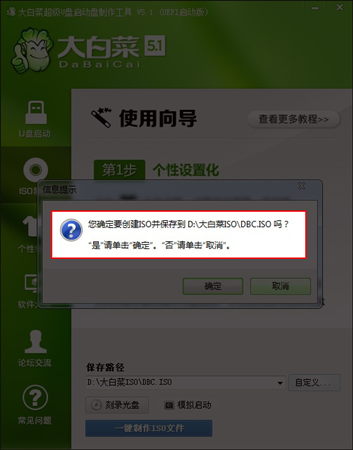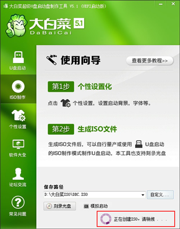 按鈕后程序會在“D:\大白菜ISO\”文件夾下創(chuàng)建DBC.ISO鏡像。