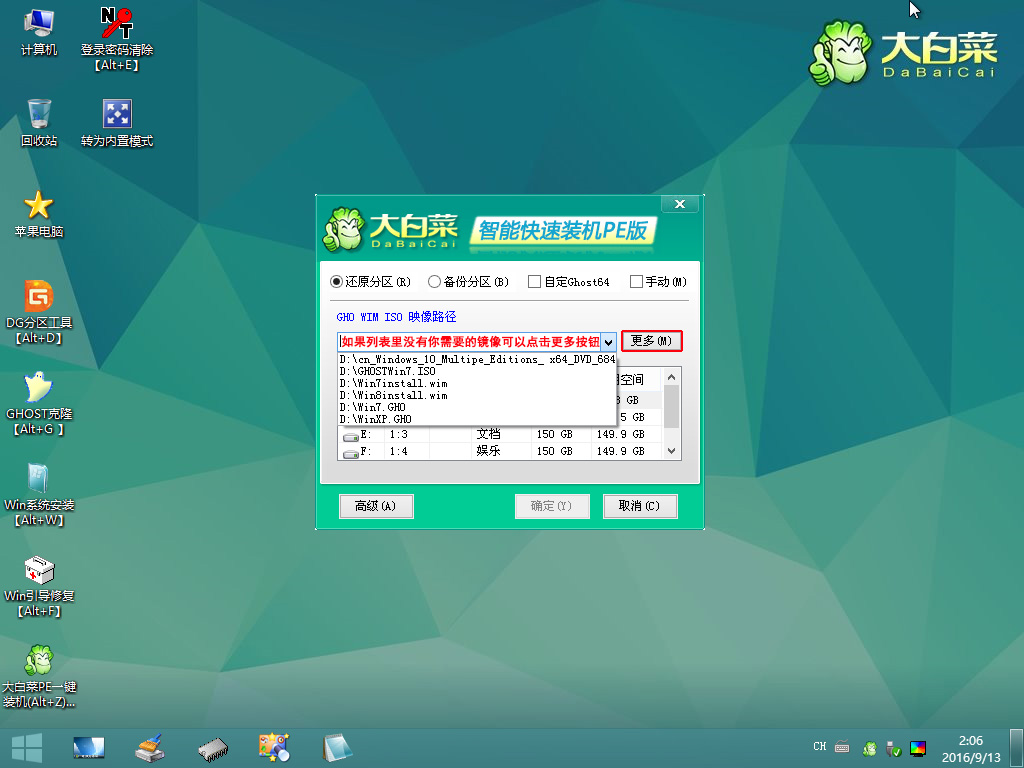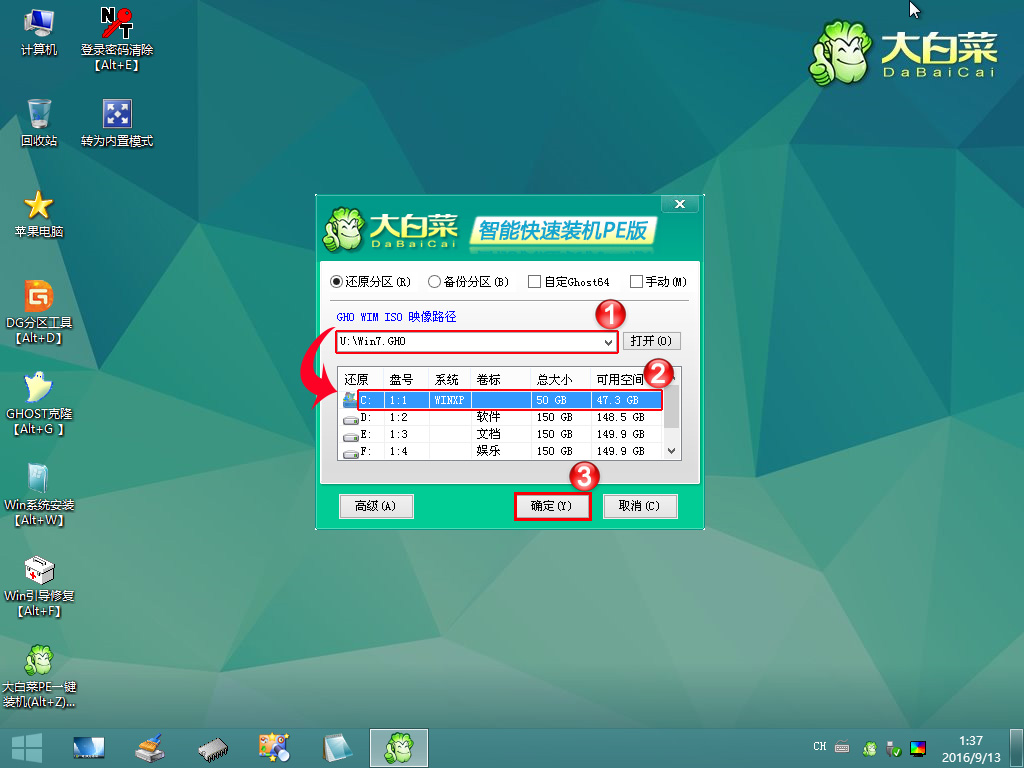 1-2:選擇需要進行還原或者安裝的系統映像(如果選擇的是iso或wim文件會被自動掛載以供進一步選擇),在磁盤列表中直接點擊選擇需要還原或安裝到哪個磁盤分區。點擊確定按鈕即可。