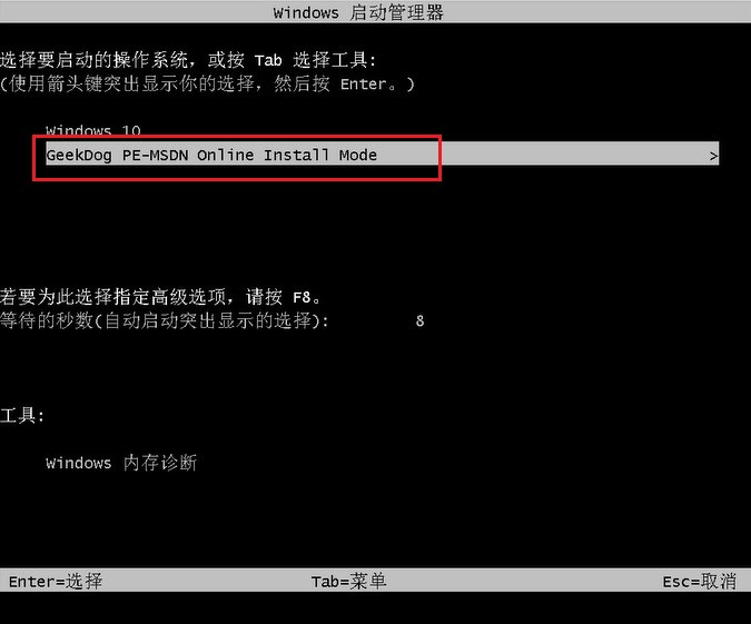 8、重啟時選擇啟動“GeekDog PE”安裝系統。