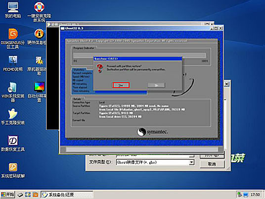 接下來一路ok之后,會(huì)彈出一個(gè)對(duì)話框問你是否將指定的GHO境像恢復(fù)到電腦的C盤去(有的機(jī)器有多塊硬盤。一定判斷是否C盤是原來的啟動(dòng)分區(qū),如果不是,請(qǐng)選擇其他盤,單硬盤的用戶一般都是C盤),點(diǎn)擊yes就可以了。