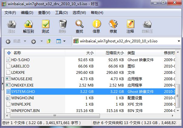 下完后用壓縮軟件,例如winrar,或者其他可以打開iso文件的軟件打開,根目錄有一個(gè)system.gho文件,這是大白菜鏡像文件,3個(gè)多G,請(qǐng)拷到你做好的U盤空間,和正常拷貝一樣。