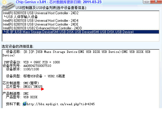 圖片上紅色箭頭上面的smi慧榮字樣,就是說的u盤的主控芯片。所謂的量產(chǎn)操作,也是要根據(jù)主控芯片選擇合適的量產(chǎn)工具。這個以后我們還會詳細(xì)的介紹。