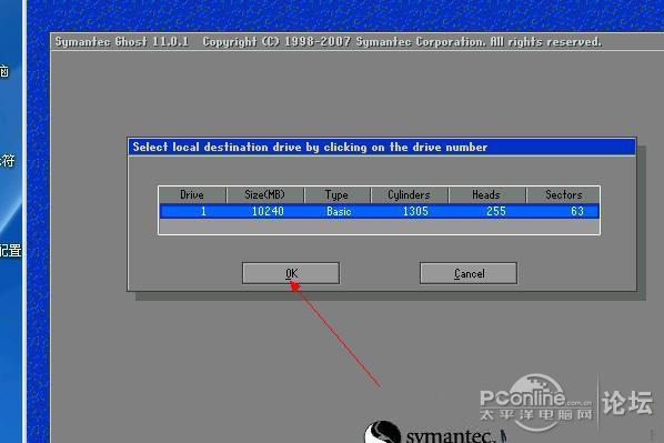 這一步是選擇安裝到哪一個硬盤。如果你有多個硬盤,大白菜官網請選擇你要安裝系統的硬盤。然后點擊[OK]進入下一步。