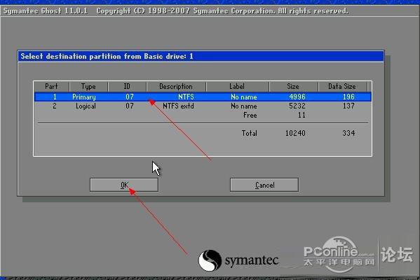 這里是要選擇安裝到的分區,即安裝在哪一個分區。一般選擇第一個分區。(即C盤)。然后點擊[OK]。