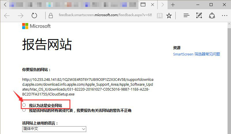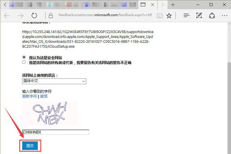 3、進入微軟的一個反饋網頁,選擇“我認為這是安全網頁”,點擊“提交”;