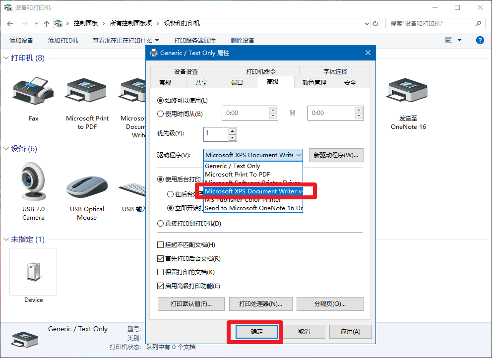 9、在打印機屬性界面點擊“高級”,將驅動程序下拉菜單選擇“Microsoft XPS Document Writer”,最后點擊“確定”即可!