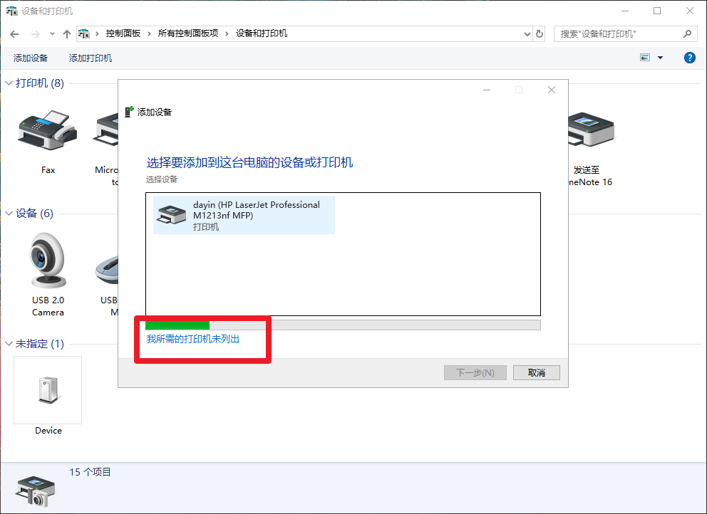 4、在選擇要添加到這臺電腦的設備或打印機,點擊“我所需的打印機未列出”