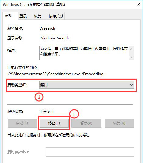 3、雙擊“Windows Search”服務,打開“Windows Search的屬性”窗口,點擊底部的“停止”按鈕,停止該服務,然后把中間的“啟用類型”設置為“禁用”,確定即可