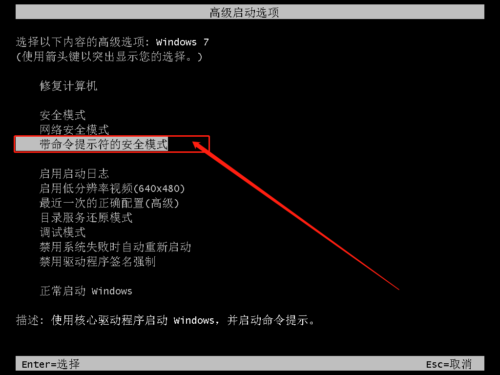 但是,仔細留意高級啟動選項頁面,我們可以發現除了安全模式之外,下面還有一個“帶命令提示符的安全模式”。