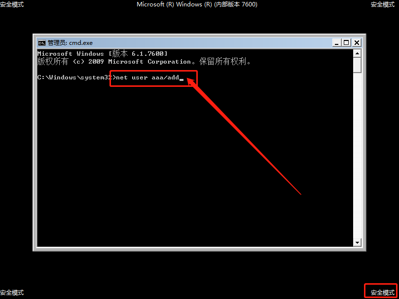 3、 隨后,會出現安全模式下的“命令頁面”,在頁面中輸入【net user aaa/add】并回車