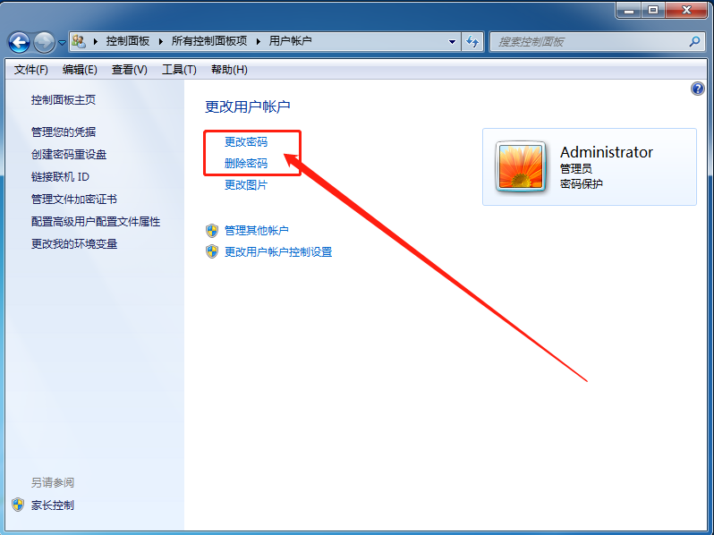 8、 進入控制面板后,點擊“用戶賬戶”,隨后你可以進行密碼“修改”或“刪除”