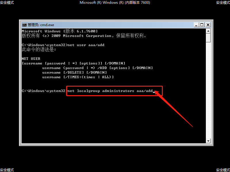 4、 命令運行完畢后,繼續輸入【net localgroup administrators aaa /add】,并回車執行命令