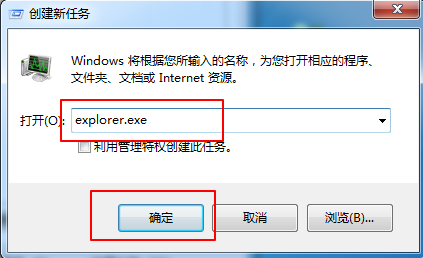 3、之后在新建任務(wù)窗口中輸入“explorer.exe”,點(diǎn)擊“確定”即可