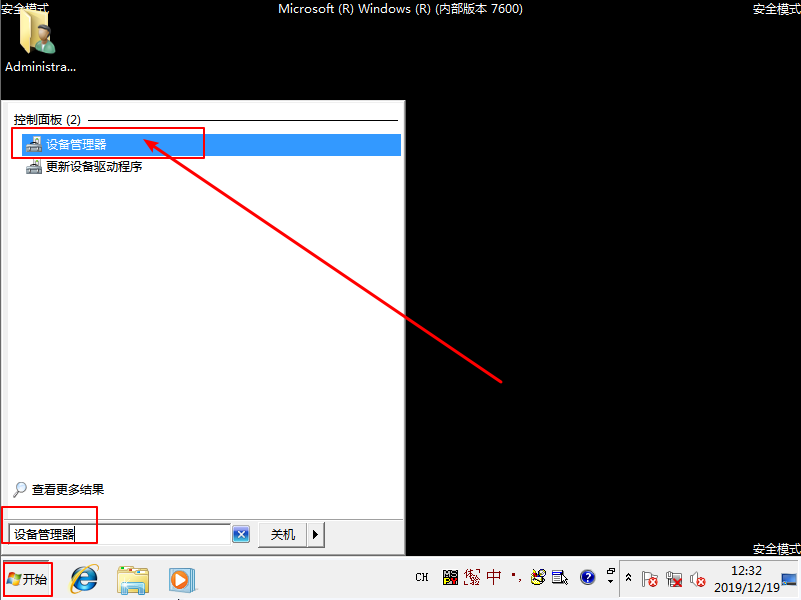 1、 進(jìn)入安全模式的桌面后,點(diǎn)擊“開(kāi)始”菜單,在搜索框中輸入并打開(kāi)“設(shè)備管理器”