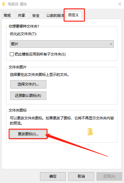 第二步:在屬性頁面,點擊“自定義”選項卡,再點擊“更改圖標”