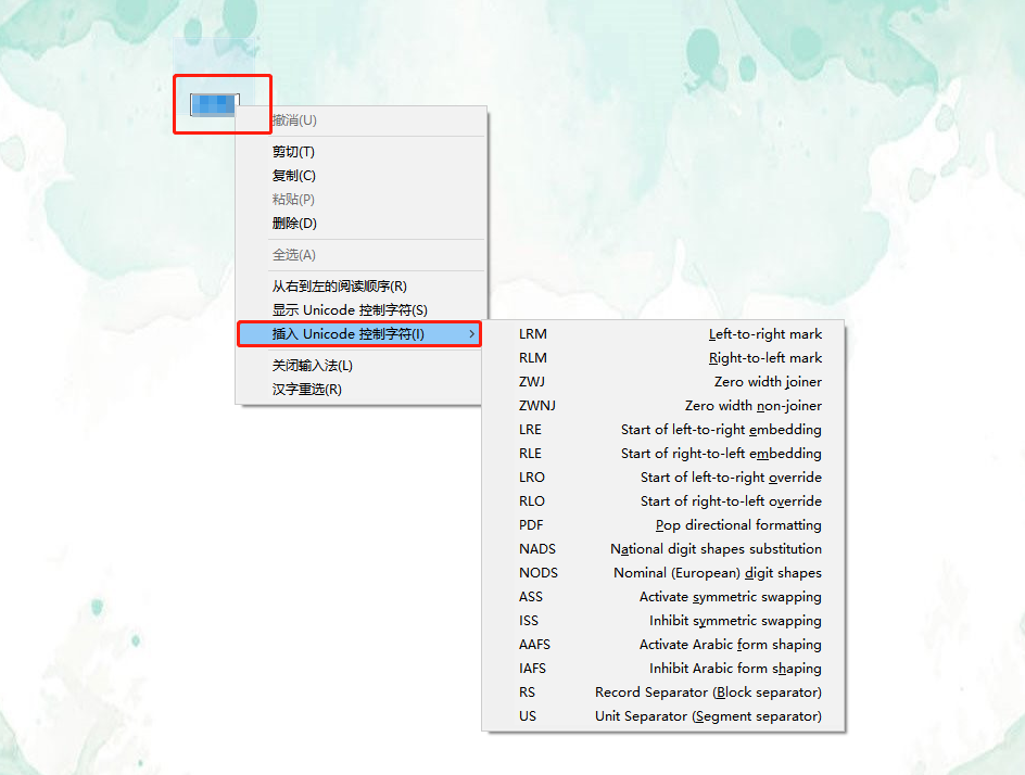 第五步:當定位在文件夾名稱修改時,右鍵選擇“插入Unicode控制字符”,然后點擊任意選項,按下“回車”即可