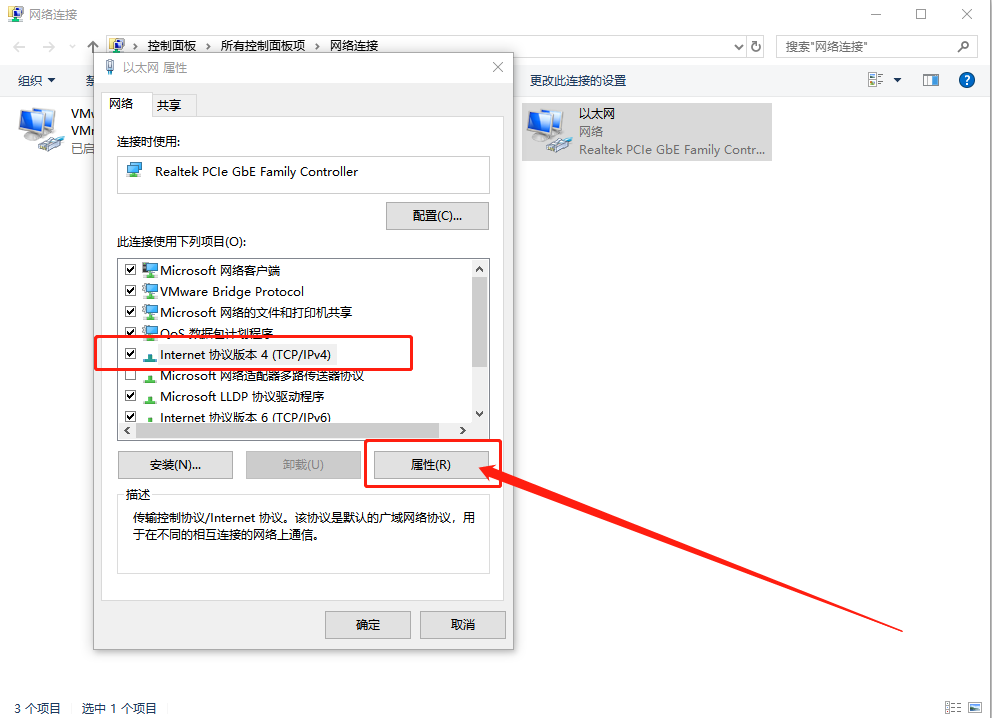 4、在以太網屬性頁面中,點擊選中“Internet協議版本TCP/IPv4”,然后點擊下面的“屬性”按鈕。
