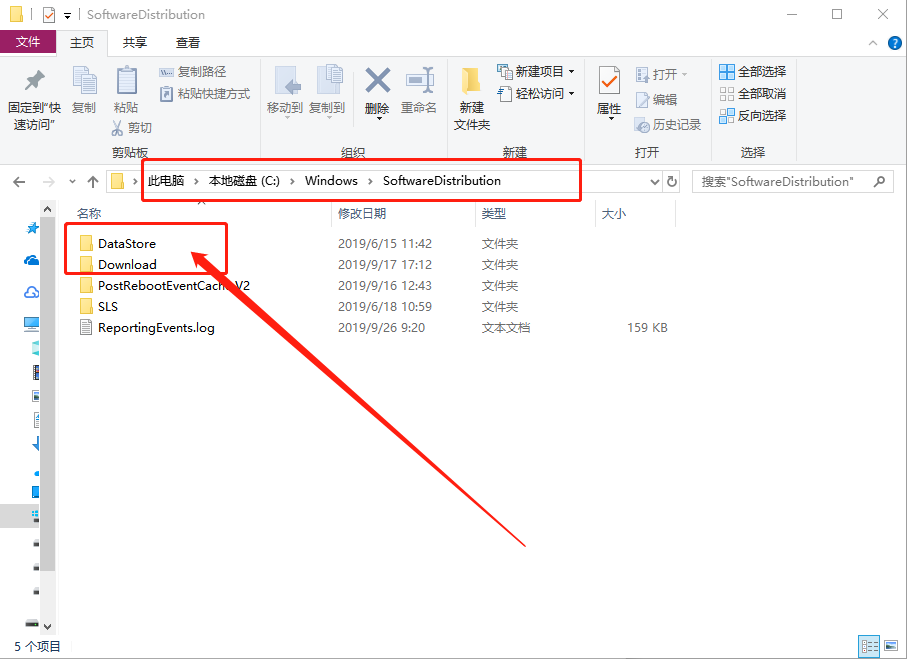 5、然后,打開此電腦,依次展開【C:\Windows\SoftwareDistribution】文件夾,在【SoftwareDistribution】 文件夾中刪除【DataStore】文件夾下的內(nèi)容和【Download】文件夾下的內(nèi)容