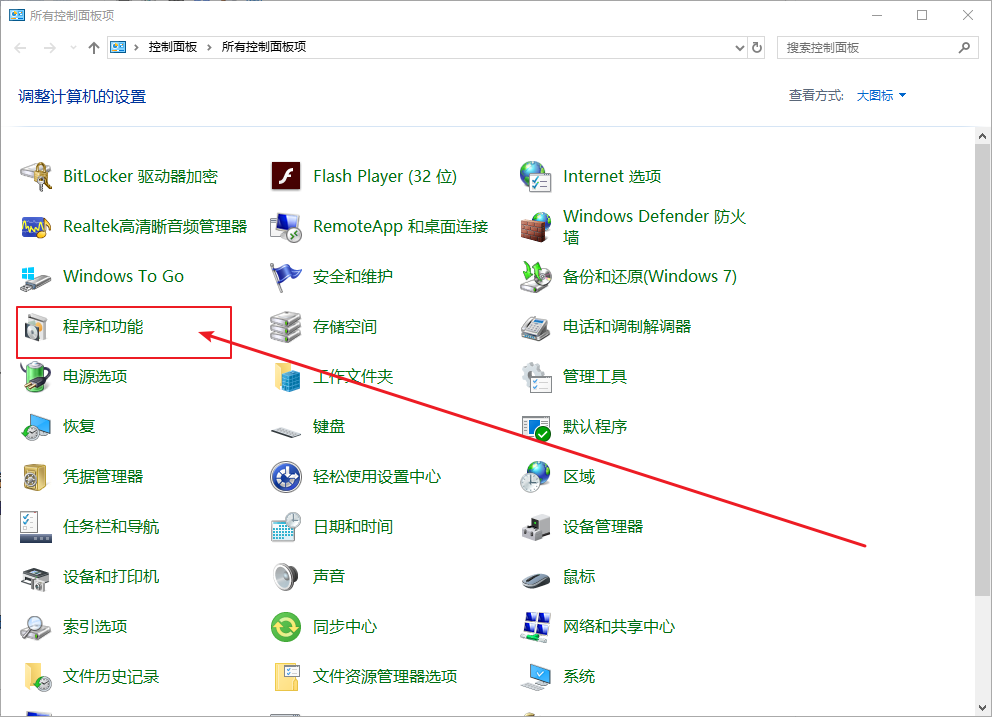 2、進(jìn)入控制面板后,打開(kāi)并點(diǎn)擊“程序與功能”