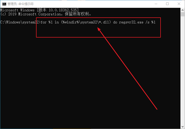 2、打開(kāi)命令頁(yè)面后,輸入【for %1 in (%windir%\system32\*.dll) do regsvr32.exe /s %1】并按回車(chē),隨后,電腦的DLL文件會(huì)重新注冊(cè)