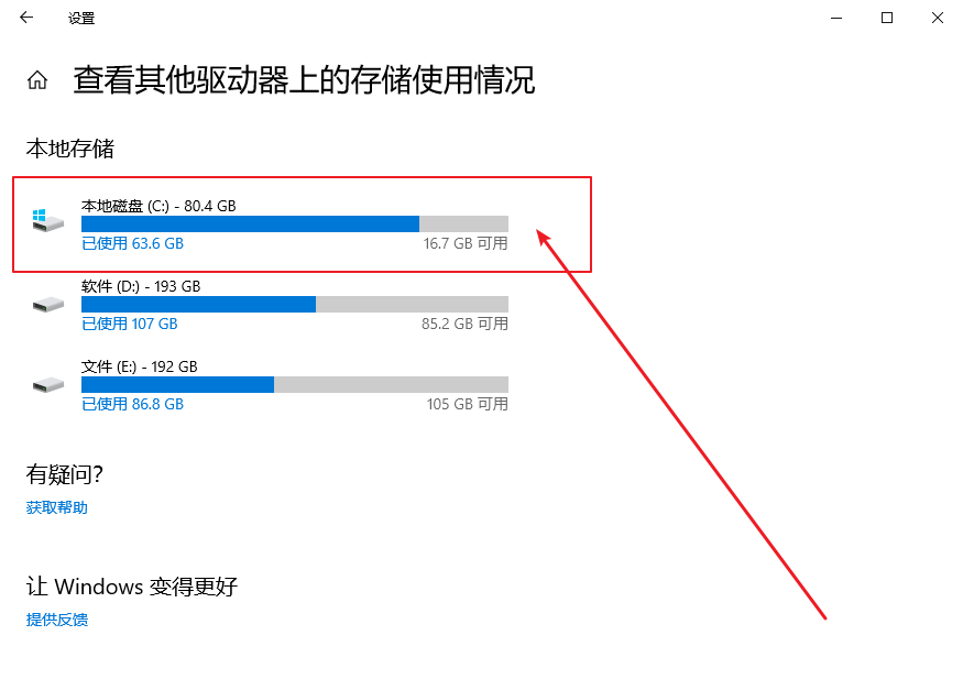 3、進入查看其他驅動器上的存儲使用情況頁面后,點擊“C盤”