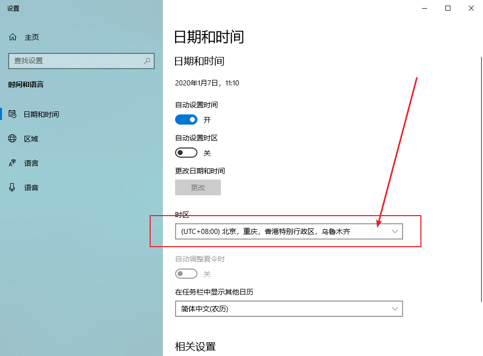 4、將右側時區下拉菜單設置為我們當前所在地區即可,如下圖所示: