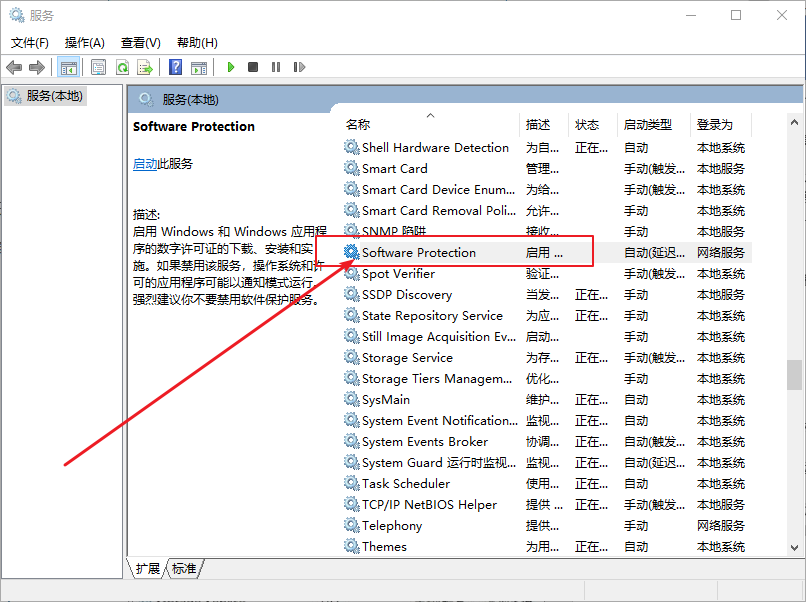 2、在服務窗口中,找到雙擊打開“software protection ”服務,確認是否開啟