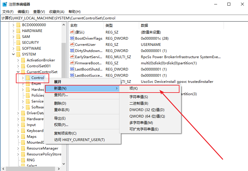 3、右擊Control文件夾,選擇新建一個名為StorageDevicePolicies的項