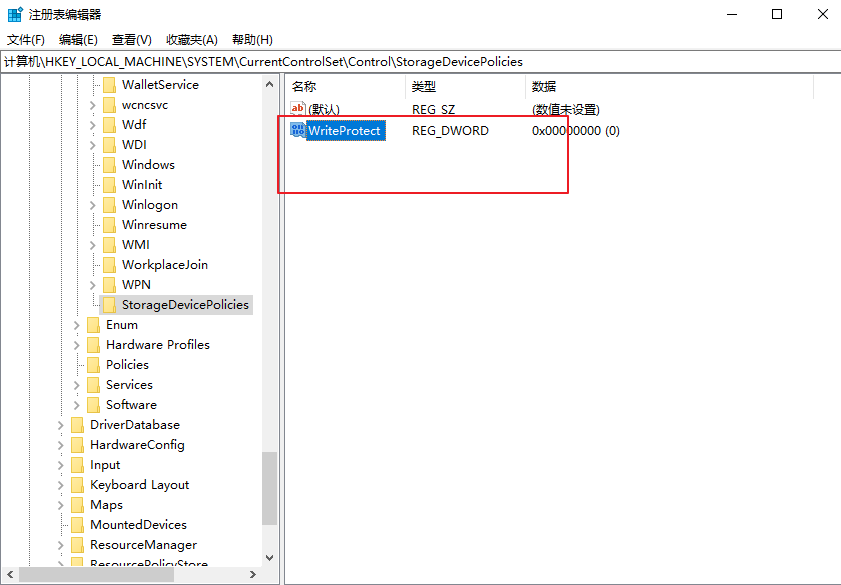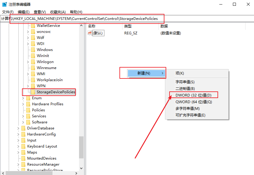 4、點擊StorageDevicePolicies項,并在右側新建一個名為WriteProtect的DWORD(32位)值