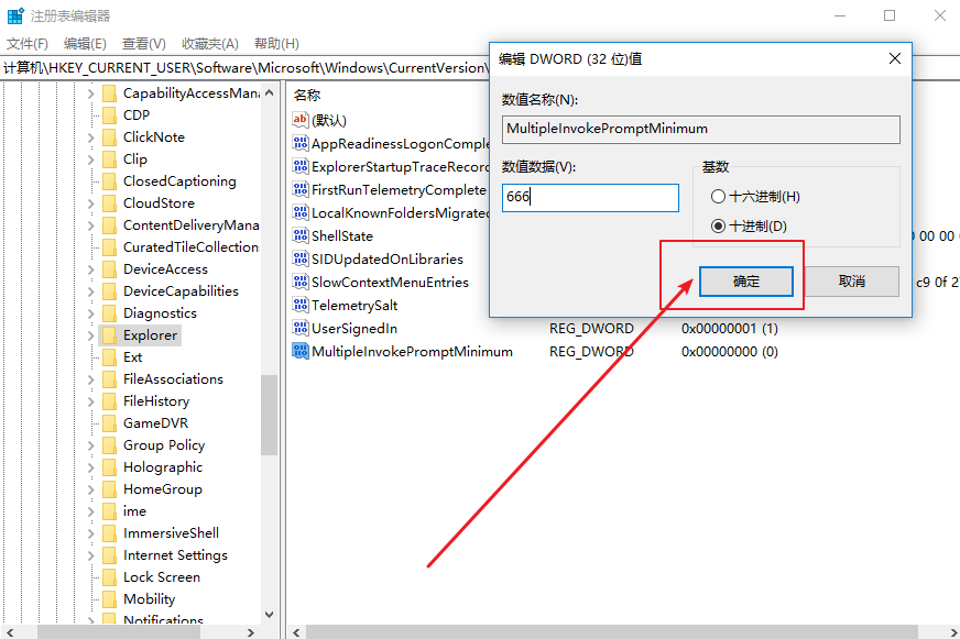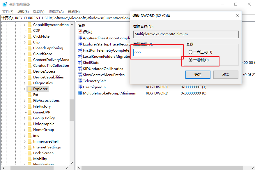 3、雙擊修改數(shù)值數(shù)據(jù),注意選擇數(shù)據(jù)格式為“十進制”,然后輸入你想啟用完整右鍵菜單的文件數(shù)量,比如 “666”;