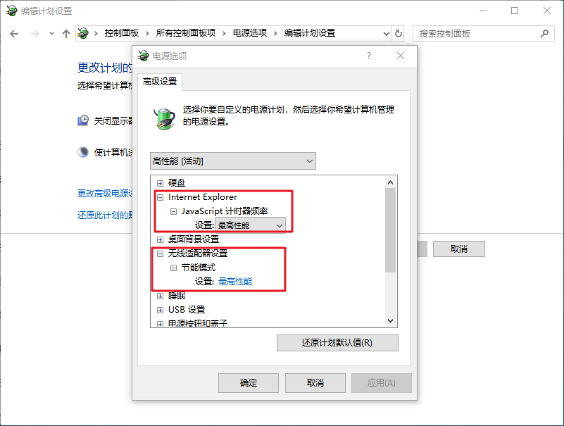 6、在電源選項界面中,將Internet Explorer和無線適配器設置為【最高性能】;