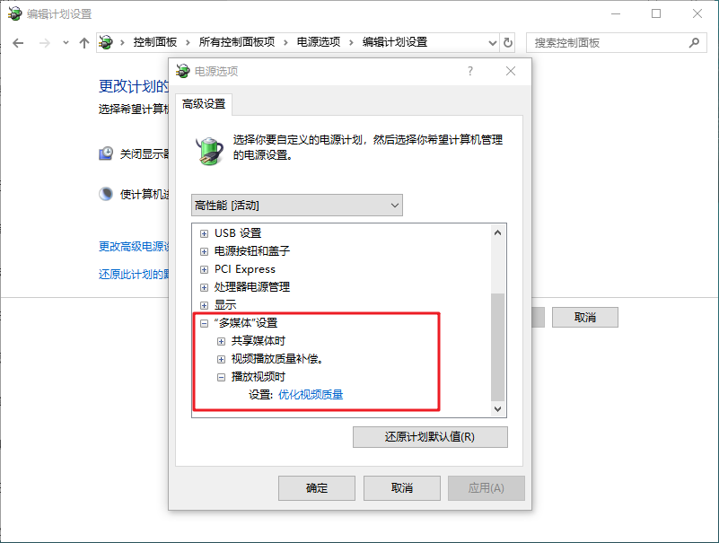8、最后,設置“多媒體設置”下方的“播放視頻時”為【優化視頻質量】,并點擊“確定”保存即可。