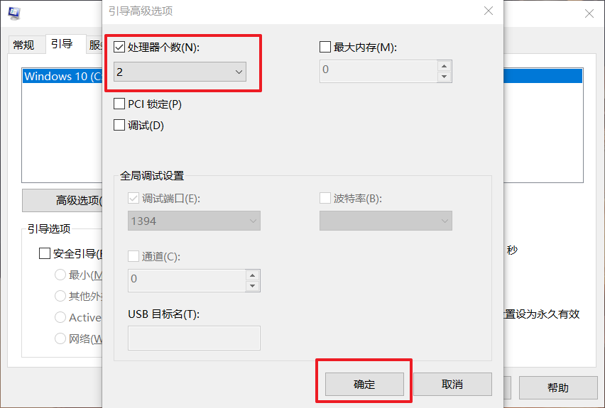8、 進入高級選項頁面后,勾選“處理器個數”,設置“處理器個數”為“2”,點擊“確定”即可