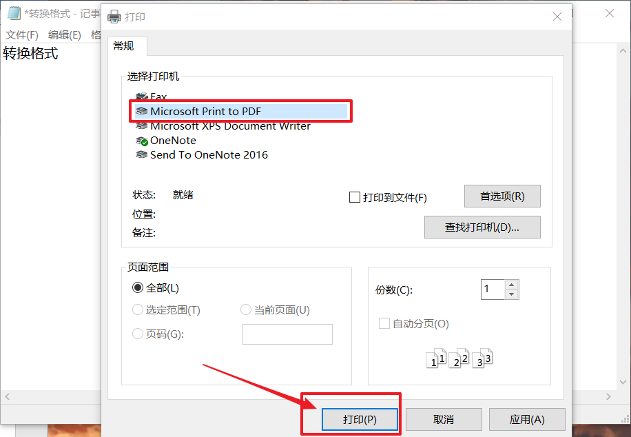 2、隨后,點(diǎn)擊選擇“Microsoft print to PDF”,然后點(diǎn)擊“打印”按鈕。
