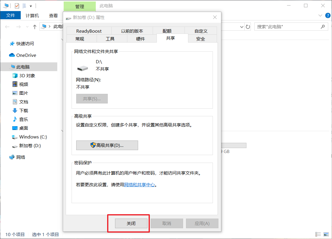 4、隨后,點擊“關(guān)閉”,即可看見磁盤共享取消