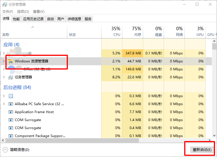 4、然后,切換到“進(jìn)程”,找到Windows資源管理器,右鍵單擊,選擇“重新啟動(dòng)”即可,
