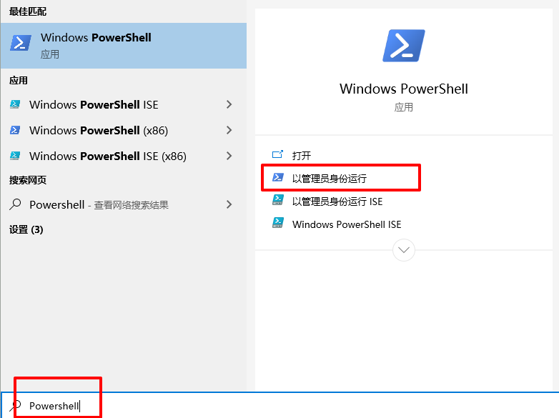 1、在桌面搜索框中輸入“Powershell”,點(diǎn)擊“以管理員身份運(yùn)行”