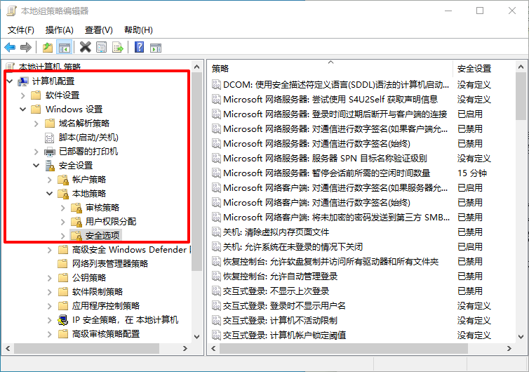 3、彈出本地組策略編輯器后,依次點擊【計算機配置】→【Windows設置】→【安全設置】→【本地策略】→【安全選項】