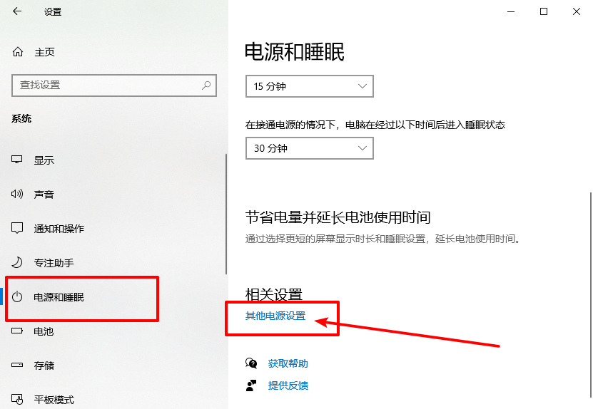 2、然后,點擊左側的“電源和睡眠”,再點擊右側的“其他電源設置”