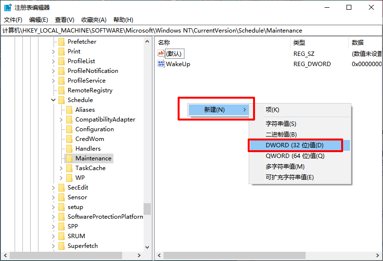 3、在右側新建DWORD(32位)值,命名為MaintenanceDisabled