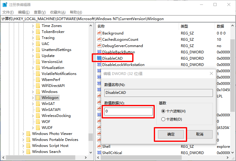3、在右側頁面找到并打開【DisableCAD】,將數值數據修改為【0】,點擊【確定】保存