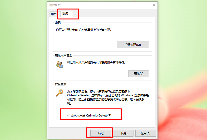 5、彈出用戶賬戶窗口后,點擊切換至【高級】選項卡,確認勾選【要求用戶按Ctrl+Alt+Delete】,最后點擊【確定】即可
