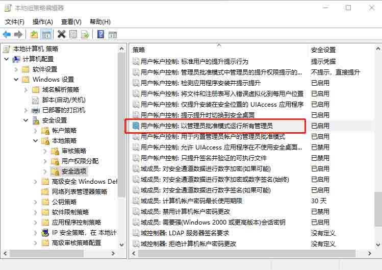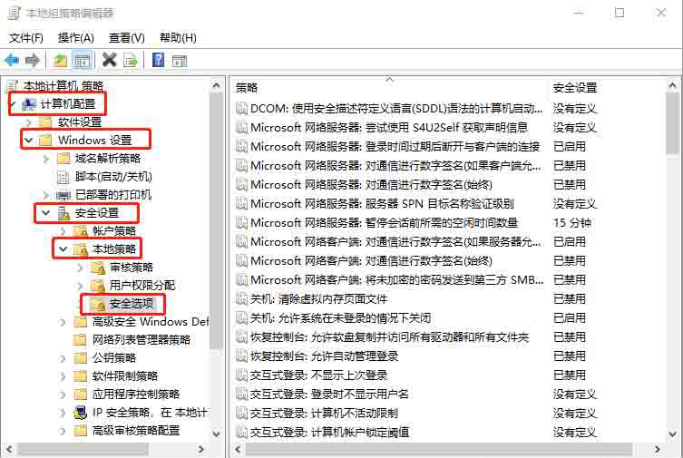 2、在組策略左側,依次展開【計算機配置→Windows設置→安全設置→本地策略→安全選項】;
