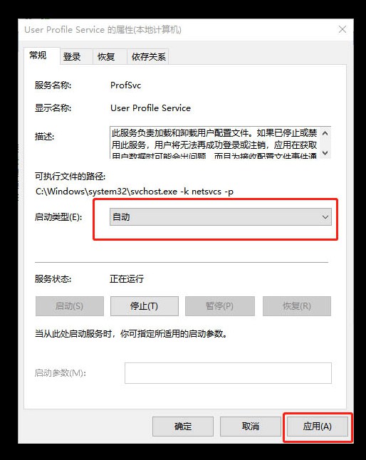 6、找到并雙擊User Profile Service服務,啟動類型選自動,點應用,然后重啟計算機即可