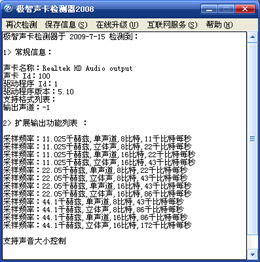綠色的聲卡檢測軟件。它能檢測聲卡ID、輸出功率、支持格式列表等信息。